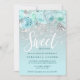 Beautiful floral Sweet 16 birthday party invitation with aqua blue mint & turquoise roses, faux silver glitter and elegant calligraphy font. Upload your favourite photo.