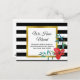 You can personalise black text with your name and new address. The custom text field says "We Have Moved" above the name and address. The background has black and white horizontal stripes. A red flower is in the lower corner. A faux (not foil) gold border surrounds the text.