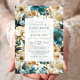 An elegant floral design in shades of teal and ivory accented with gold foliage provides the background for the charcoal grey text on a white rectangular screen. The floral design is repeated on the back of the card.