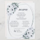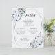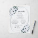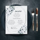 These light and airy 8.5" x 11" elegant vintage formal dinner paper sheet menus feature dark teal and mint floral design with teal lettering on a chiffon white background with the header, "Menu," and placeholders for 2 appetizers, 2 entrees, 2 sides and 2 desserts.