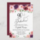 Elegant virtual 90th birthday party invitation featuring "90 & Fabulous" in a stylish script and watercolor bouquets of burgundy red, pink and purple florals.