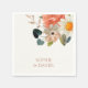 Delightful wedding napkins, featuring couple names in rich dark ochre, against a lovely chic ivory background and watercolor floral arrangement, which excudes a sense of joy and elegance.