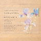 This elegant wedding invitation is perfect for spring and summer weddings. This design features watercolor irises in shades of lilac and periwinkle blue. Subtle touches of gold add a glistening, magical element.