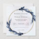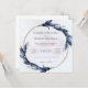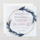 This sophisticated wedding invitation features a circular floral border with dark blue leaves, adding a touch of elegance to the design. The centred text announces the marriage of Rachelle Beaudry and Morgan Maxwell, inviting guests to the ceremony at St. Alaye Church on Saturday, August 17 at 4:00 pm, followed by a reception at L’Esperie Hotel. The clean, serif font against a light background gives the invitation a classic and timeless appeal.