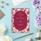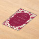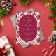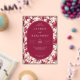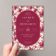 This is a vintage style image featuring an elegant wedding invitation set against a rich, floral background. The deep red roses and intricate patterns create a romantic and sophisticated atmosphere. The central oval frame in bold maroon highlights the names "Lauren and Benjamin" along with the wedding details, making it both eye-catching and easy to read. Perfect for couples who love classic designs and timeless beauty, this invitation sets the tone for a charming and memorable celebration.