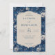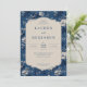 This is a vintage style image featuring an elegant wedding invitation set against a rich blue floral background. The intricate white flowers and leaves create a sophisticated, romantic atmosphere. The central cream-coloured panel displays the names "Lauren and Benjamin" in bold, with details of their special day—May 23, 2026, at Willowbrook Estate in Atlanta, Georgia. It exudes timeless charm and grace, perfect for setting the tone for a classic and memorable celebration.