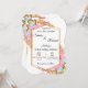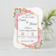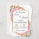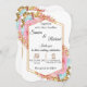 This beautifully designed wedding invitation features a delicate floral arrangement with soft pink and blue flowers surrounding a gold-outlined hexagonal frame. The text is elegantly styled with a mix of cursive and serif fonts, highlighting the names.The invitation provides details of the wedding celebration, including the date, time, and location, along with a note indicating that a reception will follow. Small icons representing a calendar and location add a modern touch to the classic design. The