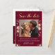 Both romantic and sophisticated, this elegant "Save the Date" postcard is designed with rich colours and florals. Features a glittery gold “Save the Date”, with beautiful blush pink and burgundy flowers on a burgundy background. A stylish way to invite family and friends to mark their calendars for your big day! Navy blue colour background is also available. Replace sample photo with your own. Design©2019 Rosalind Moore, Cherry Lane Designs