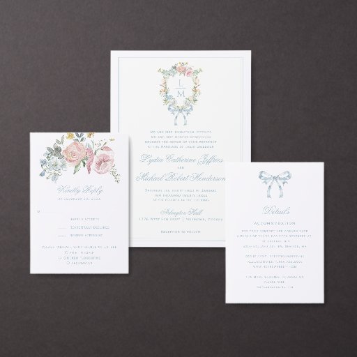 The elegant watercolor wreath monogram crest gives this wedding Save the Date a beautiful and timeless look that any sophisticated bride will love. Personalise this invitation with your initials inside the crest at the top.