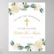 A beautiful First Holy Communion commemorative poster sign for a girl featuring the child's name in gold calligraphy and communion date framed by a watercolor wreath of white and cream roses with lush greenery and gold leaf accents. A gold cross centers the design. Perfect for display at the celebration or as a keepsake. Frame not included — customer supplies their own. All text is fully customizable.