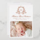 Celebrate your baby’s arrival with this elegant rose gold foil birth announcement card. The front features your baby’s monogram initial framed by a stunning rose gold foil floral crest on a white background. Your little one’s full name shines in coordinating rose gold foil calligraphy, with space below for birth stats, family name, and a horizontal newborn photo. The back showcases a matching three-photo collage, perfect for sharing more of your baby’s precious moments. Personalise with your baby’s details to create a luxurious keepsake for family and friends.