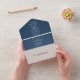 An improved version of the tri-fold invitation now with a tearaway rsvp section. Enjoy a simple design in navy blue combined with an elegant calligraphy typography, for a classic timeless look. This all-in-one sustainable invitation would save you money, no need to include RSVP envelopes, your guests will tear away the last panel and mail it back to you as a postcard.