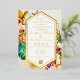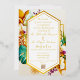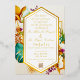 Beautifully elegant formal destination wedding invitation includes a background of lush tropical florals and botanicals around a bright gold geometric frame. Customise the text and section placements to your desired look. This design features a QR Code Mock-up that can delete and replace with your own or delete and replace with your wedding location complete address or the wedding website address.
