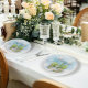 Elegant Wedding plate. Featuring a picturesque fountain, statue adorned with flowers, surrounded by charming trees, and graced by two gentle doves, this design exudes timeless elegance. The intricate details and sophisticated layout set the perfect tone for your special day. Customise with your wedding details