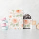 This elegant gift wrapping paper showcases a cute, contemporary French shabby chic pattern. Featuring a botanical floral design with beautifully arranged pastel coral orange red roses, blush pink, and sage green leaves set against a crisp white background. It is an original, classy, and stylish choice, making it perfect for gift wrapping or decoupage crafts. The wrapping paper is available in various modern craft and office products, including wrapping paper, gift tags, bags, favour boxes, ribbons, and envelopes.