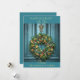 A formal lush elegant family holiday card with a deep prussian blue door, and an ornate wreath and doorknocker.