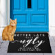 Greet your guests with humour and style using this Funny Welcome Doormat. Featuring a modern white handscript font on an elegant black background, the playful message "Better Late Than Ugly" adds a fun twist to any entryway. This customisable doormat allows you to personalise it with your own text, such as your address or any message you'd like to display. Perfect for adding a unique, welcoming touch to your home decor while creating a friendly atmosphere. A practical and stylish way to greet visitors, this personalised welcome mat is an ideal gift for housewarmings or any occasion.