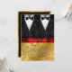 Lovely embossed gold with red satin ribbon and the word Wedding done in an elegant swirl metallic look font. There are two tuxedos with black bow ties and bright red rose bud boutonniere.