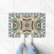 An elegant doormat featuring a beautiful pattern of flourished geometric shapes in greens, cream, tan, blue. An eye catching character filled flowery entryway doormat reminiscent of ancient mosaic tiles.