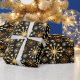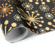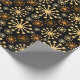 Elegant geometric pattern wrapping paper in black and gold which gives a luxurious feel to any gift. The design features a mid-century starburst pattern on a black background with gold star shapes or snowflake motif. This design style is popular and often described as retro or celestial. This elegant and modern gift wrap is suitable for birthdays, festive holidays, and other special occasions.