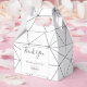 This design features an elegant black and white geometric pattern. The geometric pattern background creates the perfect backdrop for the wedding details. The combination of the black and white colours create a sophisticated, trendy and chic style. Elegant wedding favour box design with modern elements. The modern setup of the typography gives it a distinct style. Matching wedding invitations and other stationery items are also available.