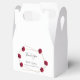 This design features elegant red roses combined with a geometric gold colour frame. The gold geometric frame is surrounded by vintage red roses. The combination of red, black and gold colours creates a sophisticated, romantic and chic style. Elegant wedding favour box design with modern elements. The simple setup of the typography gives it a distinct style. Matching wedding invitations and other stationery items are also available.