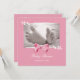 An elegant baby shower invitation with a photograph of newborn baby feet still wearing her hospital bands, framed against a feminine pink background and embellished with filigree leaves and a girly pink ribbon tied into a bow. Flat printed image, not actual ribbon.