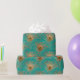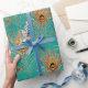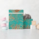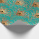 An elegant gift wrap pattern of gold glitter peacock feathers on aqua background