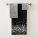 On this stylish towel set is a shimmery silver glitter pattern on the wash cloth and hand towel while on the bath towel is a shimmery silver glitter edging on black. Chic glam elegance