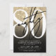 Gold Glitter 80th Birthday Party Invitation. Celebrate eighty in style with this bold and chic design. The top half features a large white “80” with a sassy handwritten black script “Eighty” layered over it, standing out against a faux gold glitter background that fades into a sleek black gradient. The bottom portion is solid black with party details in a clean white sans serif font for a modern, striking look.