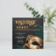 This masquerade party invitation exudes luxury and mystery with its striking black and gold colour scheme. The design features an ornate golden mask adorned with intricate details and glittering accents, symbolising elegance and intrigue. The background is a dark, rich black with swirling green smoke and gold sparkles, enhancing the mysterious aesthetic. The typography combines a bold, decorative script for the title and a clean serif font for the details, creating a stylish and sophisticated invitation perfect for an upscale masquerade event.