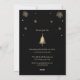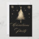 Elegant Gold Black Christmas Party Invitation designed with gold coloured Christmas Tree, Snowflakes and Text on a black background. The front text includes: Christmas Party. The reverse text includes: Please Join Us, The Date, Time, Host Names, Address and RSVP Details, in gold coloured text on a black background. To personalise, simply insert your party details into our easy template, replacing the sample text.