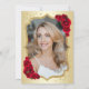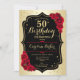 Elegant floral feminine 50th birthday invitation with your photo at the back of the card. Glam design with faux gold. Features red roses, script font and confetti. Perfect for a stylish adult bday celebration party. Personalise with your own details. Can be customised for any age! Printed Zazzle invitations or instant download digital printable template.