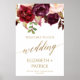 This elegant gold calligraphy floral wedding welcome poster is perfect for an autumn wedding. The design features romantic and whimsical faux gold foil typography with a gorgeous bouquet of blush pink, marsala and burgundy flowers. Customise the poster with the name of the bride and groom, and the date and location of the wedding.