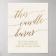This elegant gold calligraphy ivory "this candle burns" sign is perfect for a simple wedding. The neutral design features a minimalist poster decorated with romantic and whimsical faux gold foil typography.
