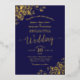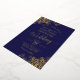 This beautiful wedding invitation features real foil printing on a navy blue background. The beautiful design has lacy script calligraphy with lacy floral filigree in the corners. Stylish, elegant, sophisticated, and chic, this invitation is fancy and glam. The navy and gold design is perfect for an evening ceremony.