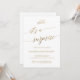 This elegant gold calligraphy surprise party invitation is perfect for a simple event. The neutral design features a minimalist card decorated with romantic and whimsical faux gold foil typography. This invitation can be used for a birthday, retirement, or any surprise party.