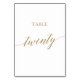 This elegant gold calligraphy table twenty table number is perfect for a simple wedding. The neutral design features a minimalist card decorated with romantic and whimsical faux gold foil typography. The card prints on the front and back (double-sided). Other table numbers in the collection are sold separately.