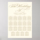 Elegant black calligraphy script wedding seating chart poster design features a monogram of the bride and groom names and wedding date and custom template text for nineteen (19) table numbers and guest names. Colours include ivory and champagne gold.