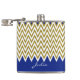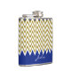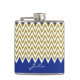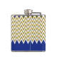 Elegant drinking flask done in a gold tone glitter and white chevron zigzag pattern, with blue accent, on the top, and a solid blue, on the bottom, of the flask.  Personalise the white script text for yourself or as a lovely gift idea.  Great for bridesmaid's gifts.