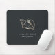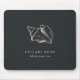 Island chic personalised mousepad for your business or home office features two lines of custom text in classic white lettering, on a soft black background adorned with a tropical conch shell illustration in faux gold foil for a beach glam look.
