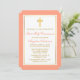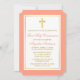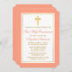 Elegant Peach and Gold First Holy Communion Invitation with Cross. Gold Frame. Gold Cross. Ticket Style.