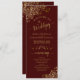 This beautiful wedding program features an elegant design with gold text on a chocolate brown or auburn coloured background and lacy golden faux foil curls and swirls in the corners. The titles are written in fancy script calligraphy, and there is space for your ceremony and wedding party details, as well as a short thank you for your guest. Wonderful way to welcome your friends and family to your wedding celebration.