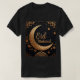 This luxurious Eid Mubarak design features a golden crescent moon with intricate floral patterns, complemented by elegant hanging ornaments on a deep black background. The stunning combination of Islamic geometric art and calligraphy makes it perfect for Eid greeting cards, festive apparel, home décor, and invitation designs. Elegant Gold Eid Mubarak Mens Tshirt.