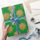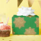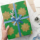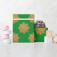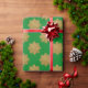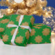 Festive wrapping paper with gold faux glitter snowflake pattern on a green background. Elegant design for presenting your gifts for the Christmas season.