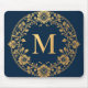 Ornate golden floral pattern encircles a bold letter 'M', design ideal for branding, invitations, or decorative purposes. The rich navy blue background enhances its luxurious and classic appearance.