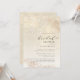 This chic invitation features a blush pink peach textured background accented with gold dust and a white flower.