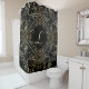 Elegant Gold Foil Look Scrollwork Script on Black Shower Curtain