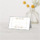 An elegant white wedding place card featuring an ornate gold frame with a centred red heart, the bride and groom's names on the back and their wedding date.