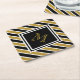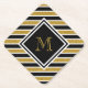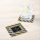 This personalised paper coaster features a customisable gold monogram in black frame on a faux gold glitter, black and white striped background.